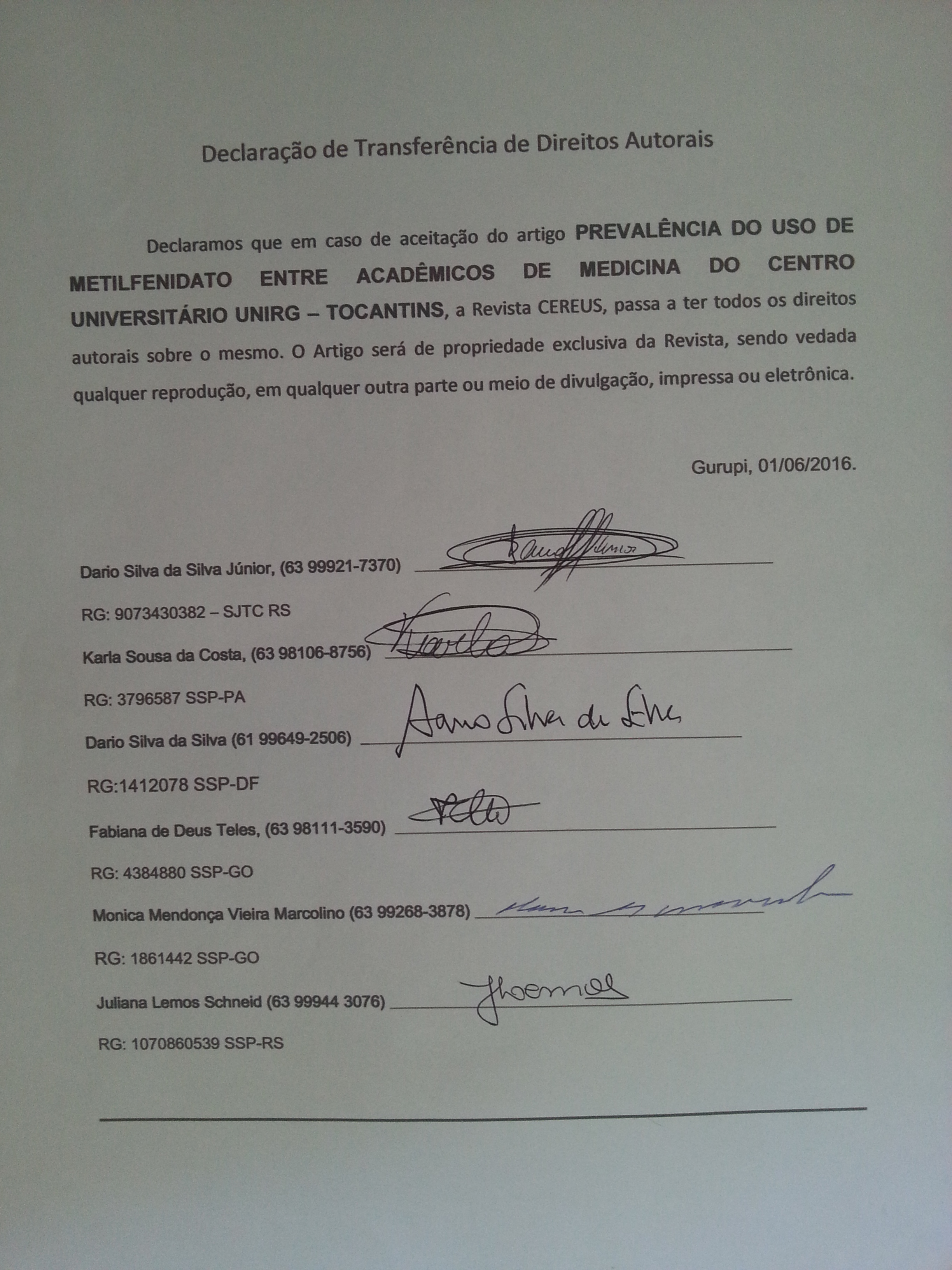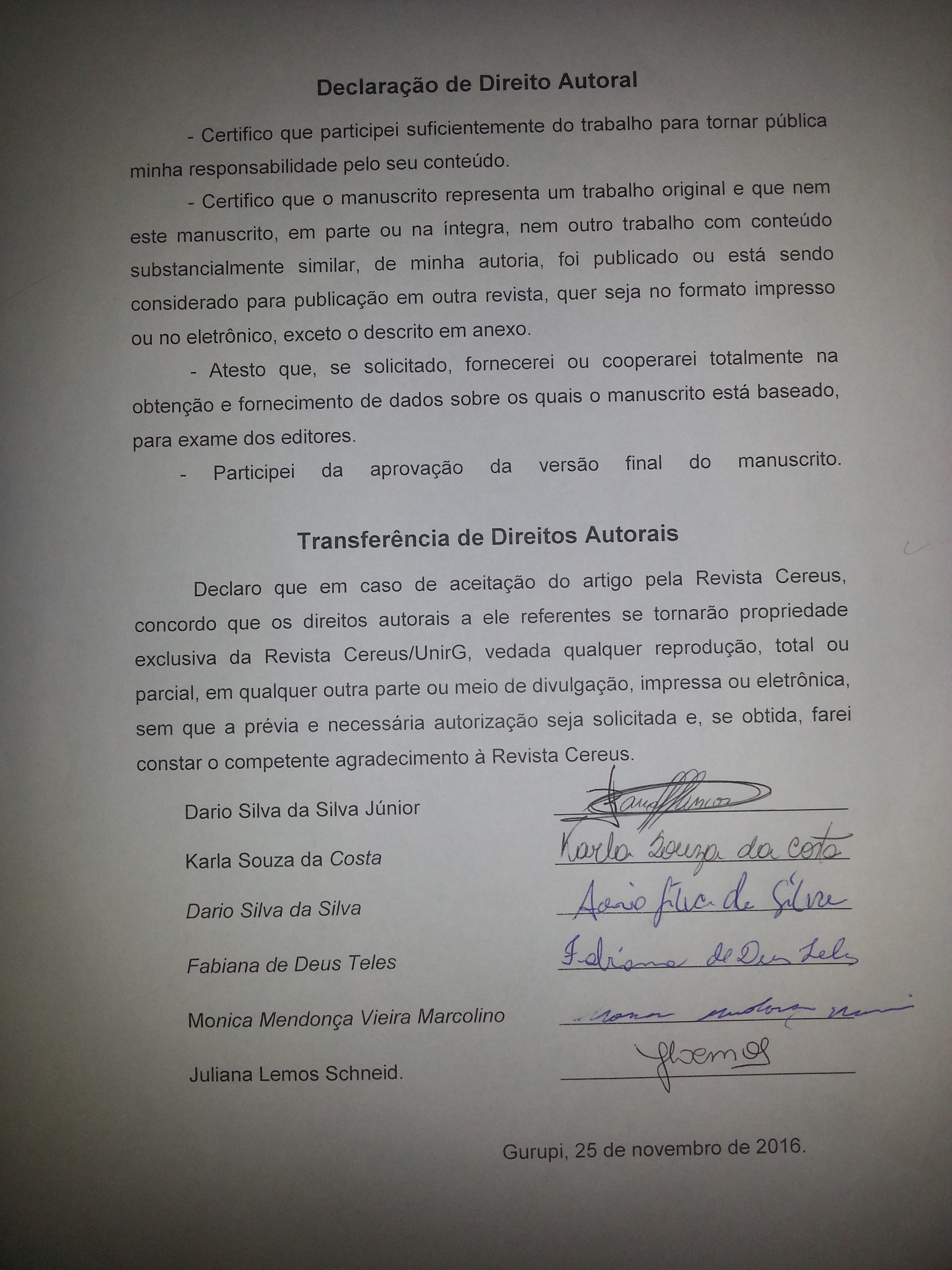 Os autores do manuscrito submetido declaram ter conhecimento que em caso de aceitação do artigo, a Revista Cereus, passa a ter todos os direitos autorais sobre o mesmo. O Artigo será de propriedade exclusiva da Revista, sendo vedada qualquer reprodução, em qualquer outra parte ou meio de divulgação, impressa ou eletrônica.
