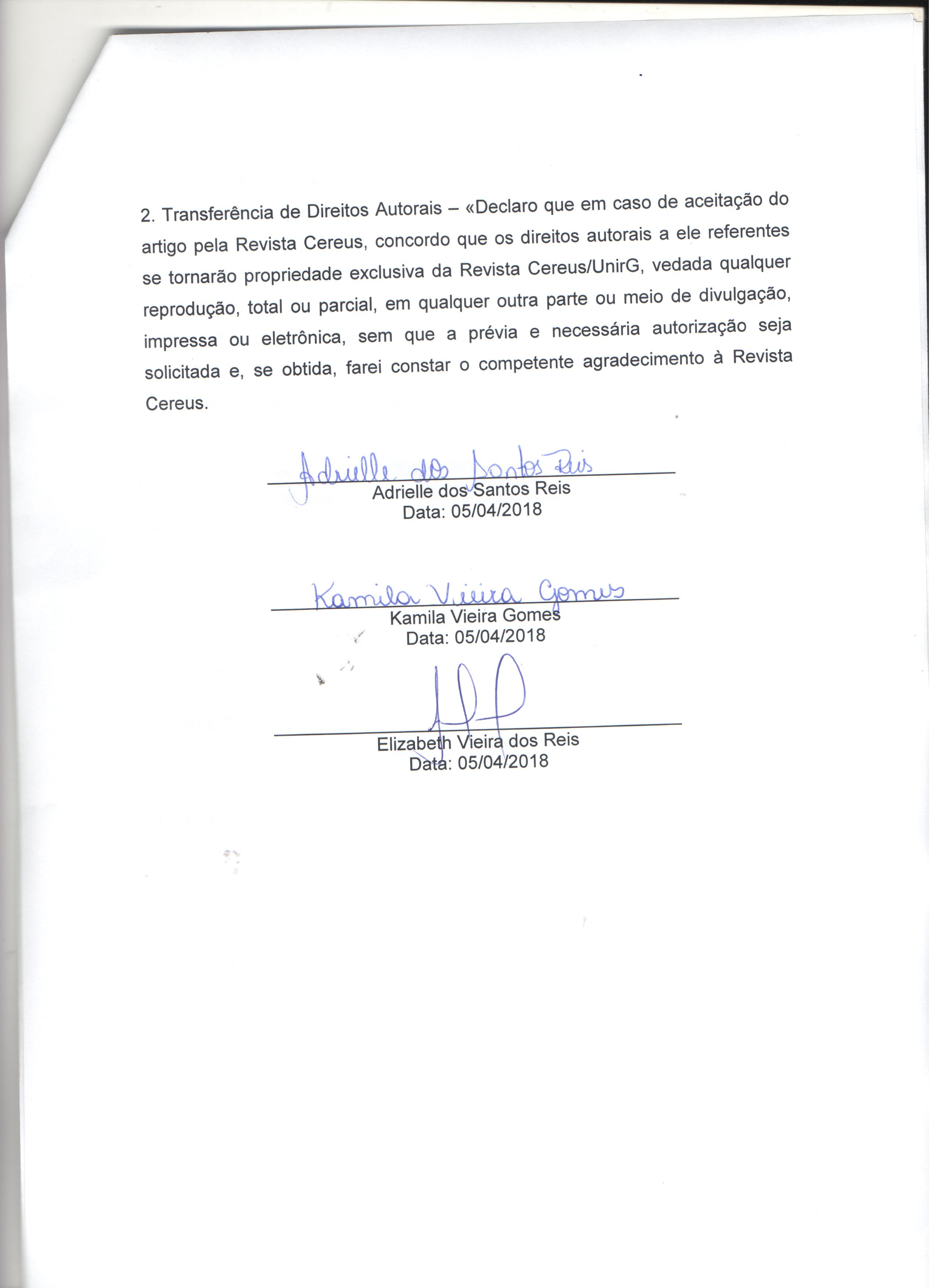 Os autores do manuscrito submetido declaram ter conhecimento que em caso de aceitação do artigo, a Revista Cereus, passa a ter todos os direitos autorais sobre o mesmo. O Artigo será de propriedade exclusiva da Revista, sendo vedada qualquer reprodução, em qualquer outra parte ou meio de divulgação, impressa ou eletrônica.
