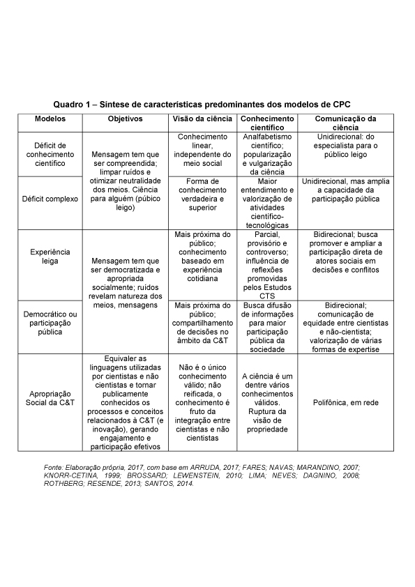 O artigo tem o objetivo de analisar e compreender os quatro modelos existentes da comunicação pública, além de promover uma reflexão no que diz respeito à aproximação e fusão da Comunicação Pública da Ciência (CPC) com o Campo Ciência, Tecnologia e Sociedade (CTS). Também propõe questionamentos que buscam refletir qual dos possíveis modelos de comunicação pública já existentes se alinham aos pressupostos do Campo CTS por abarcarem uma noção mais democrática e acessível e que viabilizem a real apropriação social da ciência. Para fomentar estas reflexões, o método utilizado foi o de levantamento bibliográfico, com revisão de literaturas nacional e internacional na área. A publicação aponta que o modelo de déficit é atualmente predominante na divulgação científica do Brasil e que, portanto, a participação pública ainda é incipiente e os cidadão ainda não assumiram um papel protagonista no que diz respeito à apropriação social da ciência. Também resulta num quadro elucidativo sobre as diferenças e particularidades de dois principais modelos, sugerindo, por fim, que o modelo democrático de comunicação pública e um possível quinto modelo, de apropriação social da ciência, são os que mais se aproximam dos Estudos CTS e vão de encontro com uma comunicação pública da ciência mais democrática e participativa.
