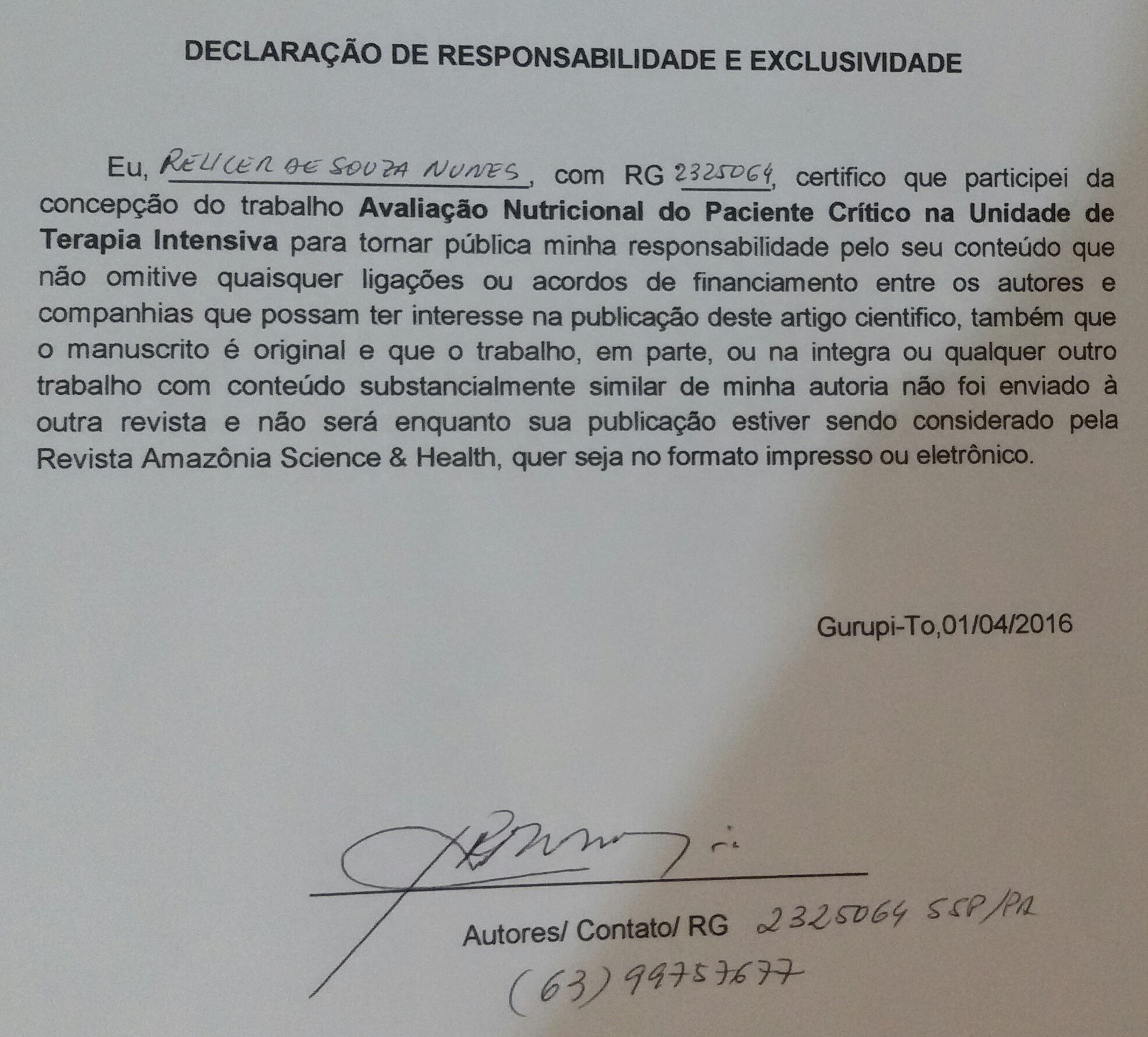 - 1º Os autores cedem à Revista Amazônia: Science & Health os direitos autorais no momento em que submetem seus artigos à mesma. Os autores declaram que o artigo submetido não foi publicado, e não está sendo considerado para publicação, na íntegra ou em parte em outro periódico. Os autores assumem total responsabilidade pela originalidade do artigo, podendo incidir sobre os mesmos, eventuais encargos decorrentes de reivindicação, por parte de terceiros, em relação à autoria do artigo.