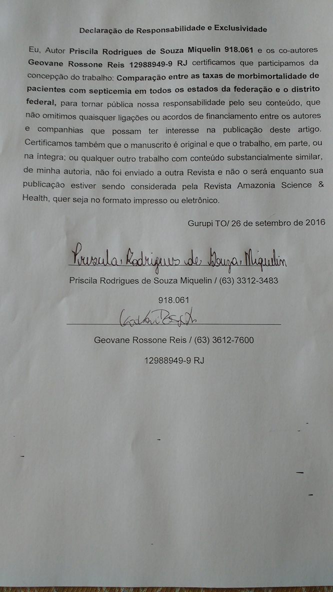 - 1º Os autores cedem à Revista Amazônia: Science & Health os direitos autorais no momento em que submetem seus artigos à mesma. Os autores declaram que o artigo submetido não foi publicado, e não está sendo considerado para publicação, na íntegra ou em parte em outro periódico. Os autores assumem total responsabilidade pela originalidade do artigo, podendo incidir sobre os mesmos, eventuais encargos decorrentes de reivindicação, por parte de terceiros, em relação à autoria do artigo.
