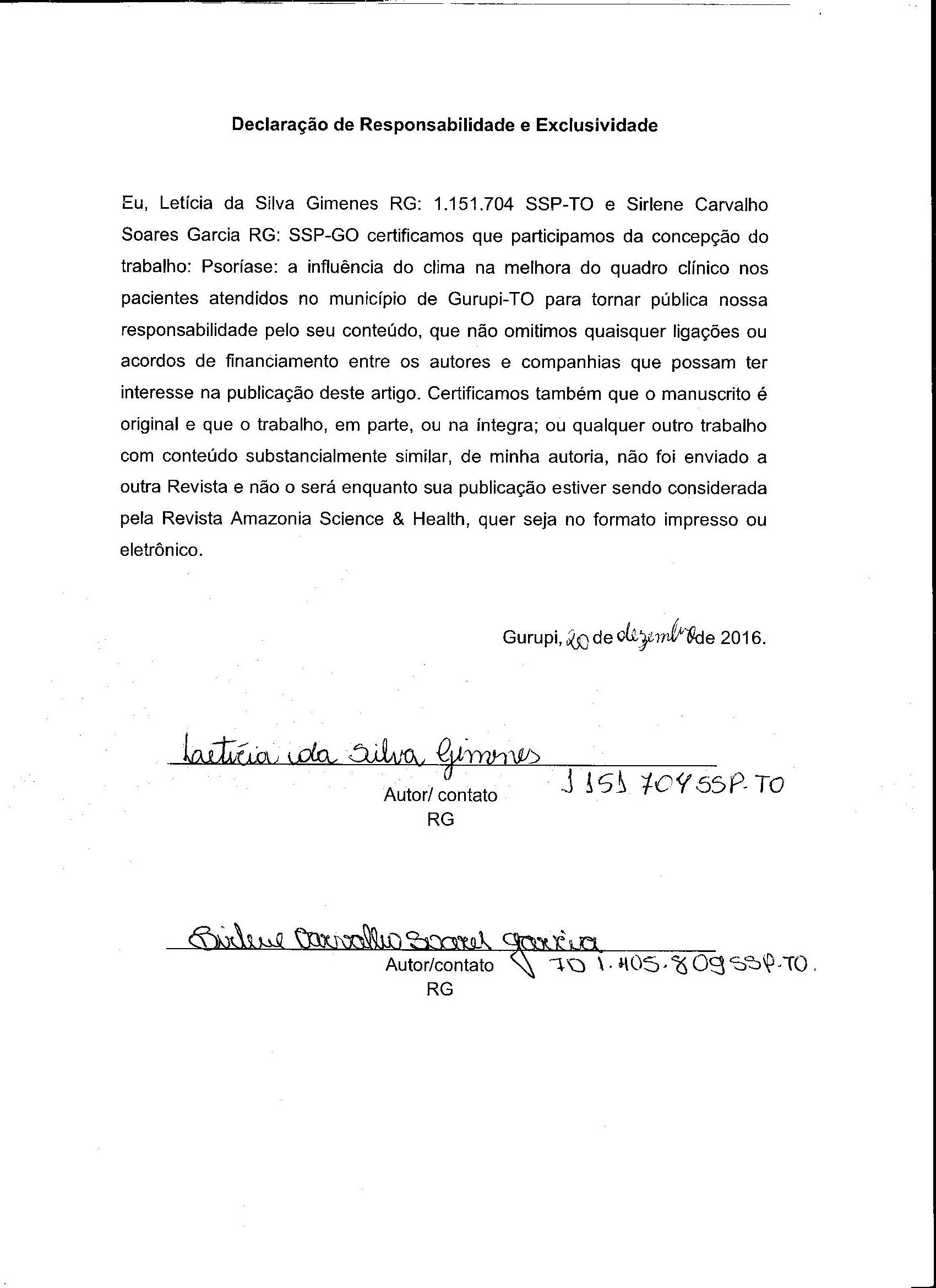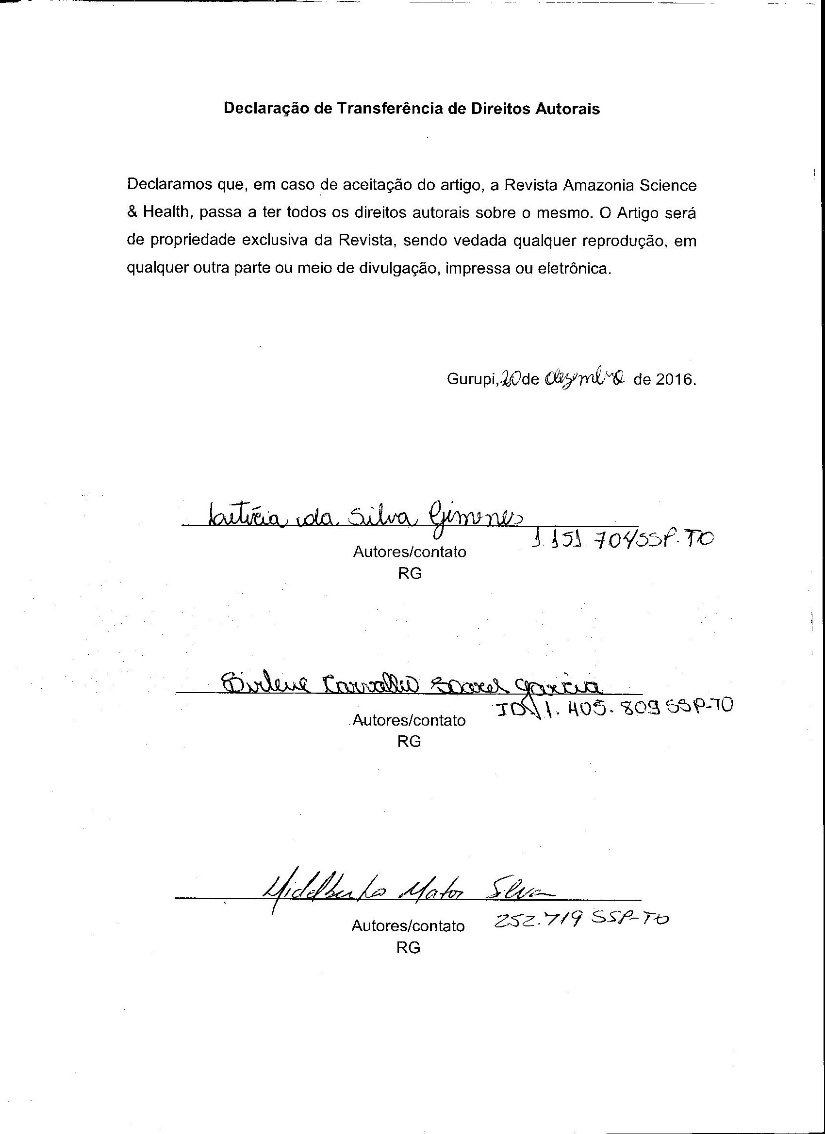 - 1º Os autores cedem à Revista Amazônia: Science & Health os direitos autorais no momento em que submetem seus artigos à mesma. Os autores declaram que o artigo submetido não foi publicado, e não está sendo considerado para publicação, na íntegra ou em parte em outro periódico. Os autores assumem total responsabilidade pela originalidade do artigo, podendo incidir sobre os mesmos, eventuais encargos decorrentes de reivindicação, por parte de terceiros, em relação à autoria do artigo.