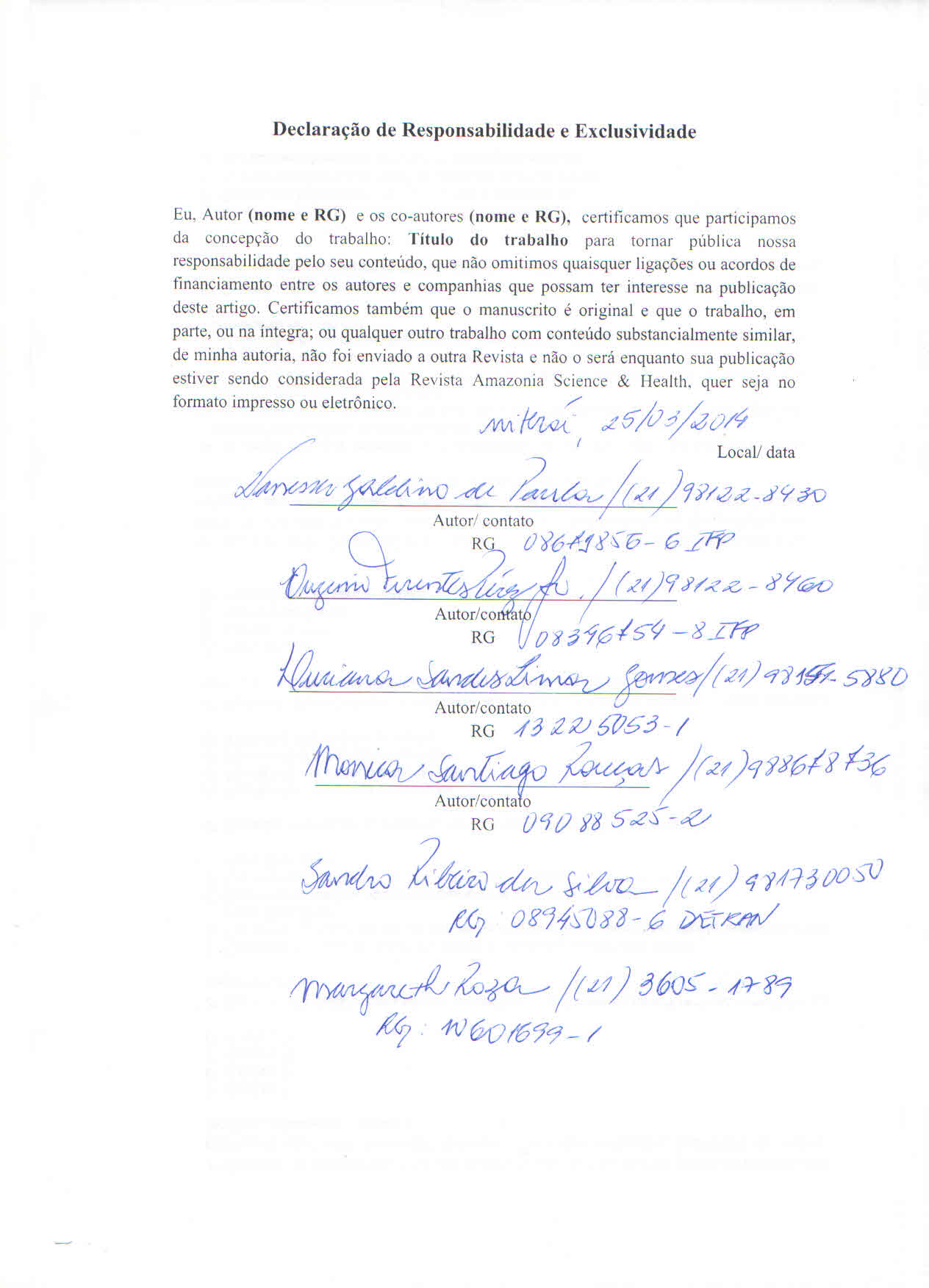 - 1º Os autores cedem à Revista Amazônia: Science & Health os direitos autorais no momento em que submetem seus artigos à mesma. Os autores declaram que o artigo submetido não foi publicado, e não está sendo considerado para publicação, na íntegra ou em parte em outro periódico. Os autores assumem total responsabilidade pela originalidade do artigo, podendo incidir sobre os mesmos, eventuais encargos decorrentes de reivindicação, por parte de terceiros, em relação à autoria do artigo.