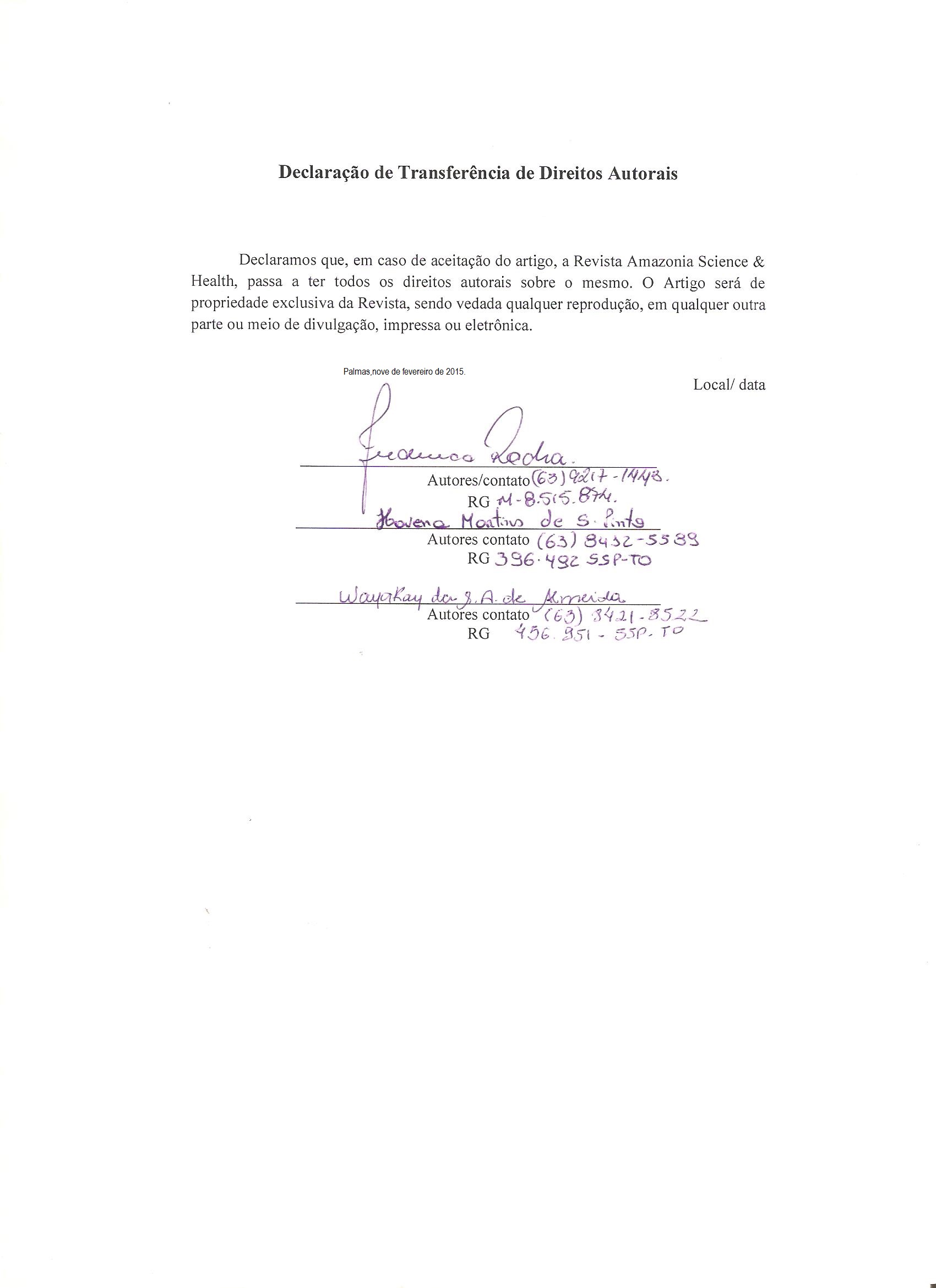 - 1º Os autores cedem à Revista Amazônia: Science & Health os direitos autorais no momento em que submetem seus artigos à mesma. Os autores declaram que o artigo submetido não foi publicado, e não está sendo considerado para publicação, na íntegra ou em parte em outro periódico. Os autores assumem total responsabilidade pela originalidade do artigo, podendo incidir sobre os mesmos, eventuais encargos decorrentes de reivindicação, por parte de terceiros, em relação à autoria do artigo.