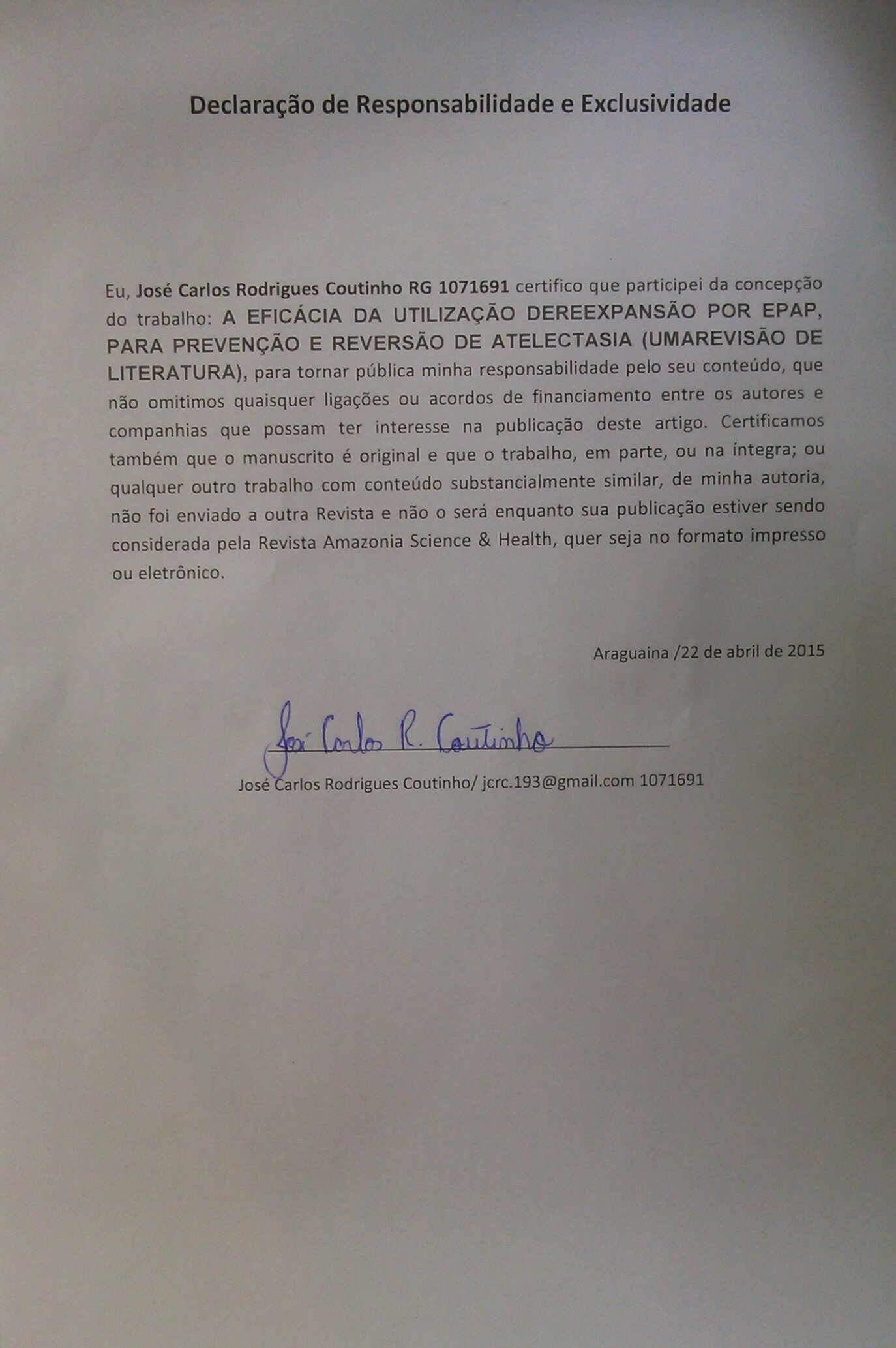 - 1º Os autores cedem à Revista Amazônia: Science & Health os direitos autorais no momento em que submetem seus artigos à mesma. Os autores declaram que o artigo submetido não foi publicado, e não está sendo considerado para publicação, na íntegra ou em parte em outro periódico. Os autores assumem total responsabilidade pela originalidade do artigo, podendo incidir sobre os mesmos, eventuais encargos decorrentes de reivindicação, por parte de terceiros, em relação à autoria do artigo.