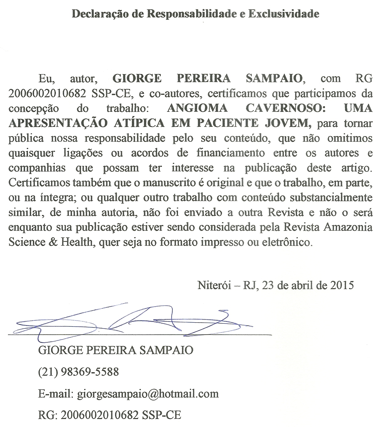 - 1º Os autores cedem à Revista Amazônia: Science & Health os direitos autorais no momento em que submetem seus artigos à mesma. Os autores declaram que o artigo submetido não foi publicado, e não está sendo considerado para publicação, na íntegra ou em parte em outro periódico. Os autores assumem total responsabilidade pela originalidade do artigo, podendo incidir sobre os mesmos, eventuais encargos decorrentes de reivindicação, por parte de terceiros, em relação à autoria do artigo.