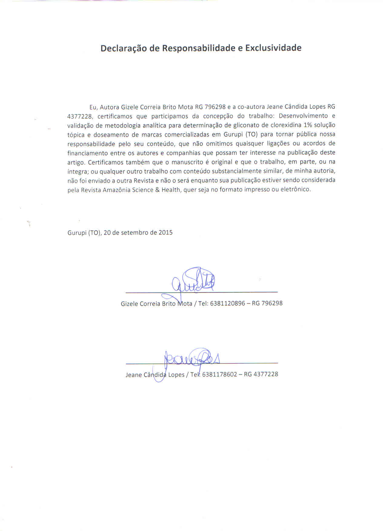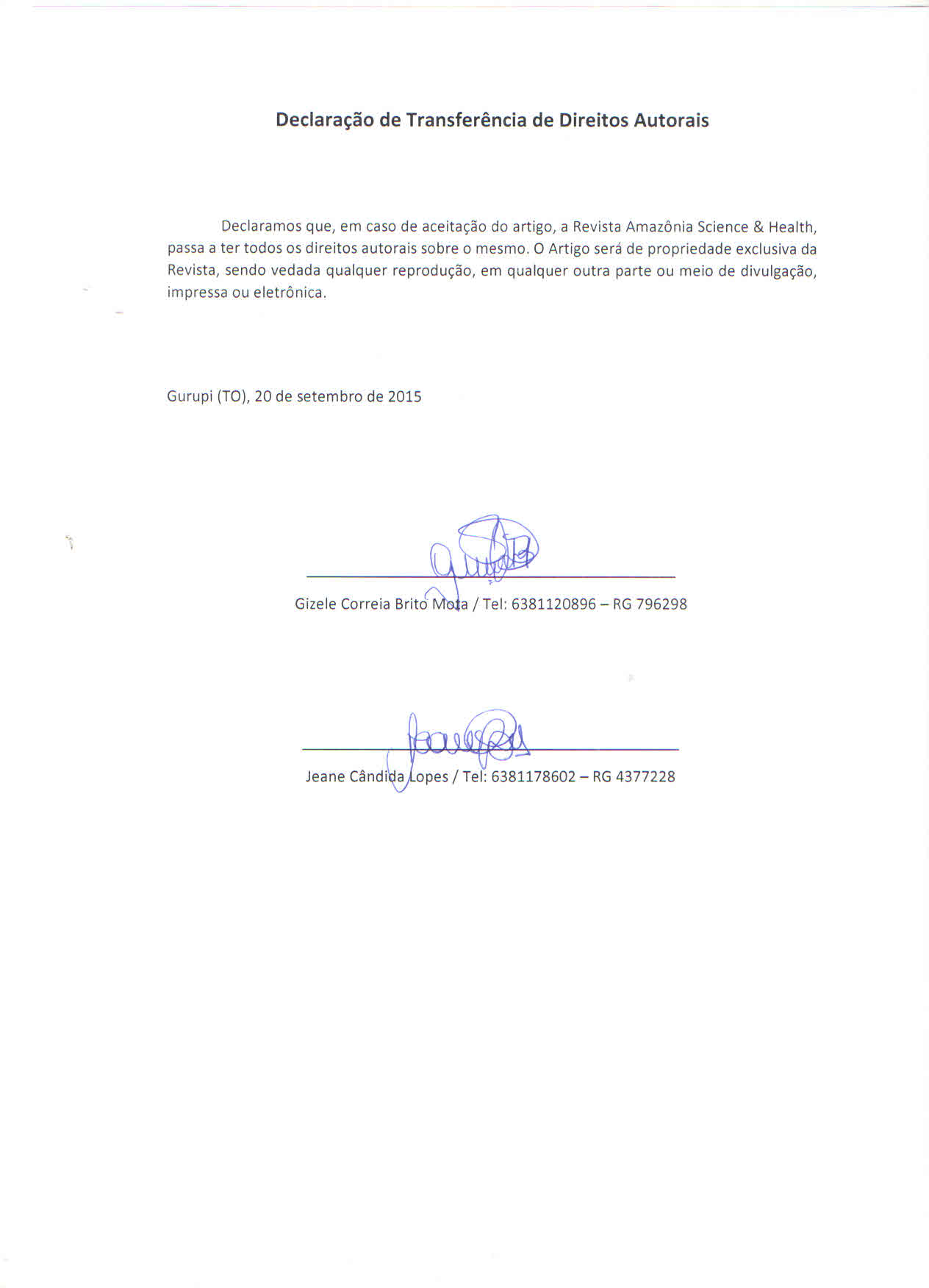 - 1º Os autores cedem à Revista Amazônia: Science & Health os direitos autorais no momento em que submetem seus artigos à mesma. Os autores declaram que o artigo submetido não foi publicado, e não está sendo considerado para publicação, na íntegra ou em parte em outro periódico. Os autores assumem total responsabilidade pela originalidade do artigo, podendo incidir sobre os mesmos, eventuais encargos decorrentes de reivindicação, por parte de terceiros, em relação à autoria do artigo.